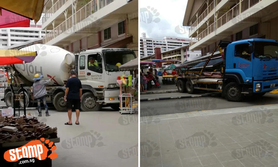 A concerned Stomper sent Stomp two videos showing how passers-by have to make way for the lorries when they come through, so that they can reverse and head on to a renovation site nearby.