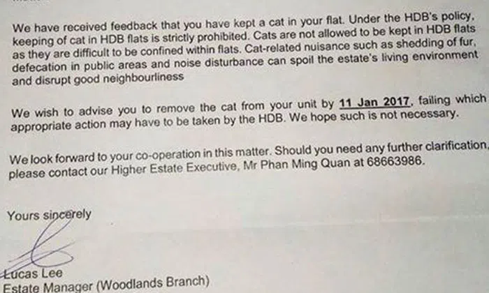 Facebook user Alfredo Seow posted a photo of a letter from the Housing and Development Board (HDB) his friend had received, advising him to "remove" his cat from his home by Jan 11 after receiving feedback that he was keeping a cat in his flat.