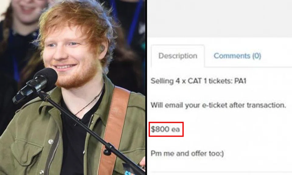 Tickets for Ed Sheeran's world tour concert at the Singapore Indoor Stadium on Nov 11 and 12 are being sold at online marketplace Carousell and online ticket exchange website Viagogo for up to $2,750.