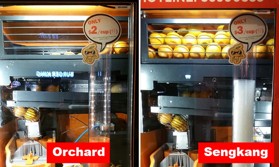 According to Vanillaijs, the orange juice dispensers in Orchard and Selegie charge only $2 for a cup but a smaller cup from dispensers in Sengkang costs $3 instead.