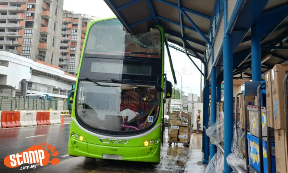 The front of the upper deck of the bus service 85, operated by Go-Ahead Singapore, looked badly damaged due to part of the bus shelter piercing through the windscreen.