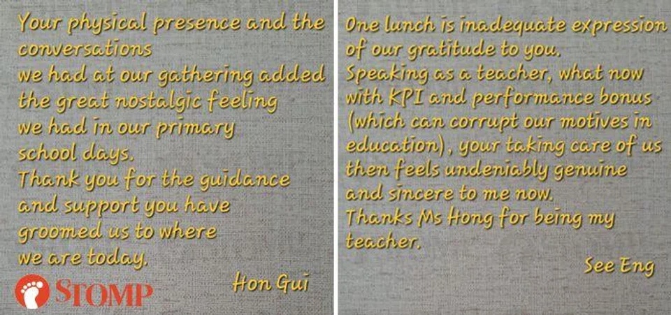Liew Eng said: "Thank you Stomp for your big help and search for long-lost ones. It is deeply appreciated. We have found 10 people, including our form teacher, and seven of us met up with her for a New Year's Day reunion lunch."