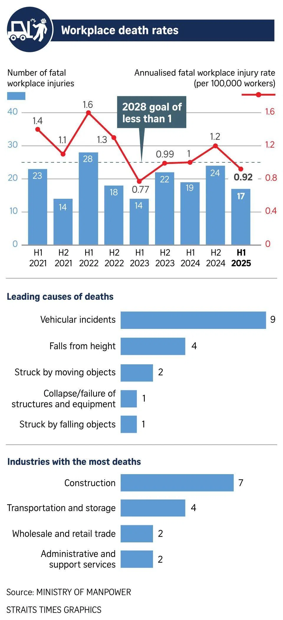 Seventeen people died from injuries sustained at work in the first half of 2025. Nine of them were killed in vehicular incidents, which remains the top cause of workplace deaths.