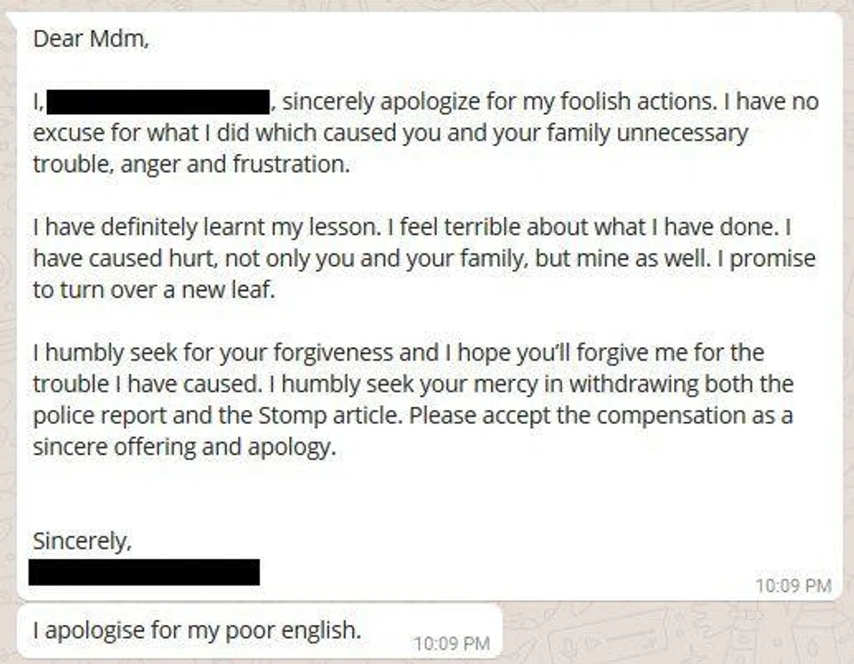 Dear Mdm, I, (name withheld by Stomp), sincerely apologize for my foolish actions. I have no excuse for what I did which caused you and your family unnecessary trouble, anger and frustration. I have definitely learnt my lesson. I feel terrible about what I have done. I have caused hurt, not only you and your family, but mine as well. I promise to turn over a new leaf. I humbly seek for your forgiveness and I hope you’ll forgive me for the trouble I have caused. I humbly seek your mercy in withdrawing both the police report and the Stomp article. Please accept the compensation as a sincere offering and apology. Sincerely, (name withheld by Stomp)
