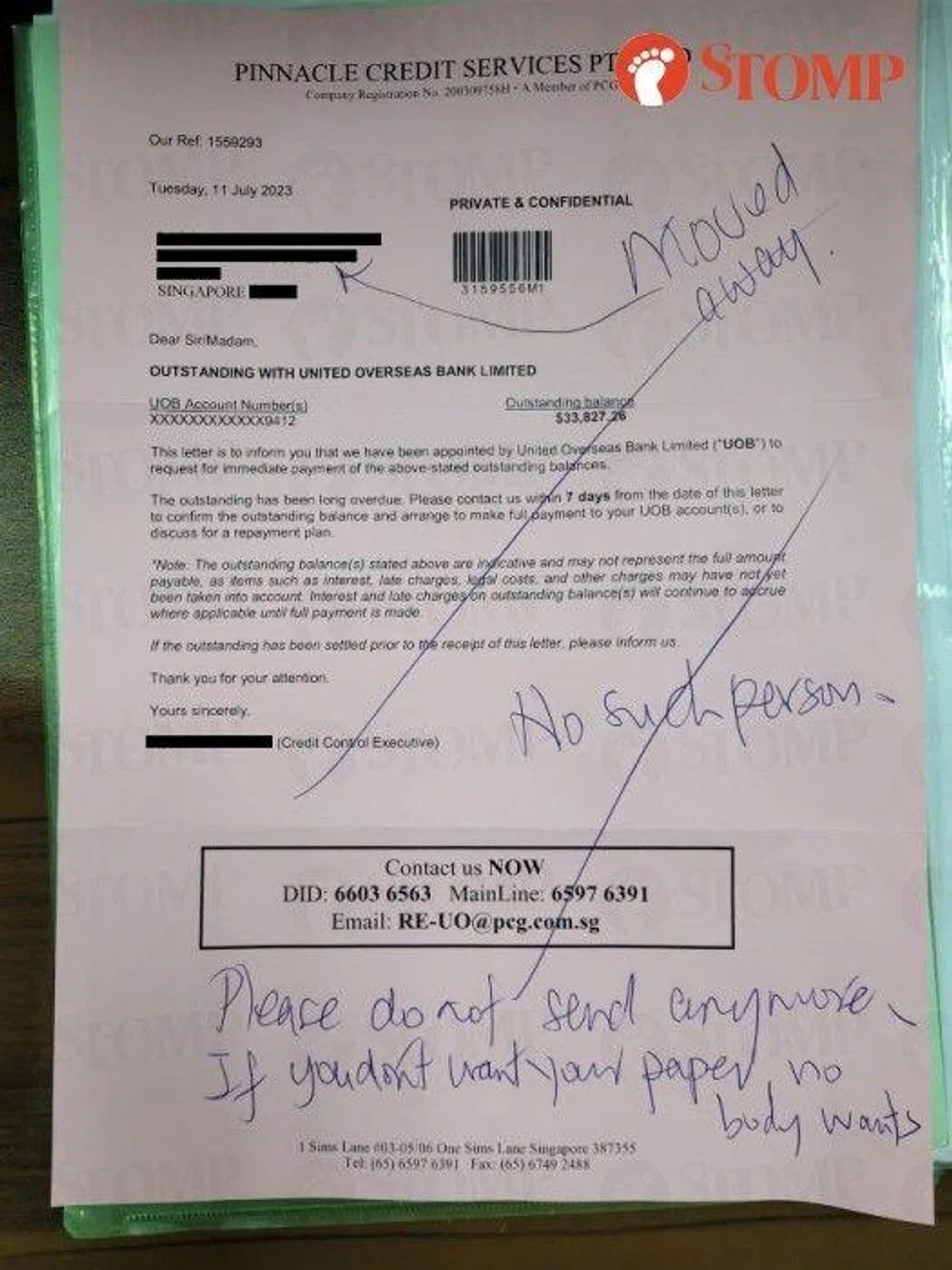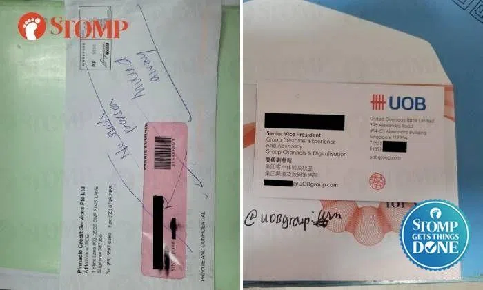 The Stomper had earlier shared a copy of a letter from Pinnacle Credit Service, which said that the company had been appointed by UOB to request payment for an outstanding balance of $33,872.26.