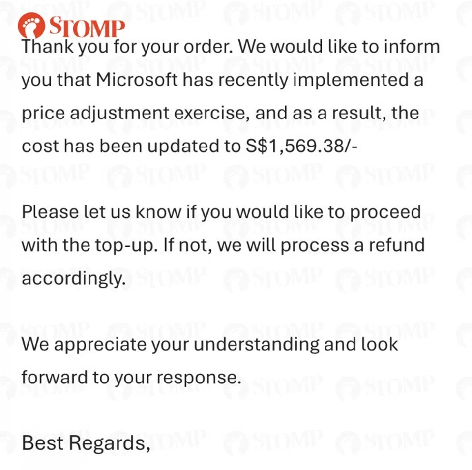 "However, to my surprise, the seller replied three days later, citing a price increase by Microsoft and saying I now have to pay $1569.38 instead."