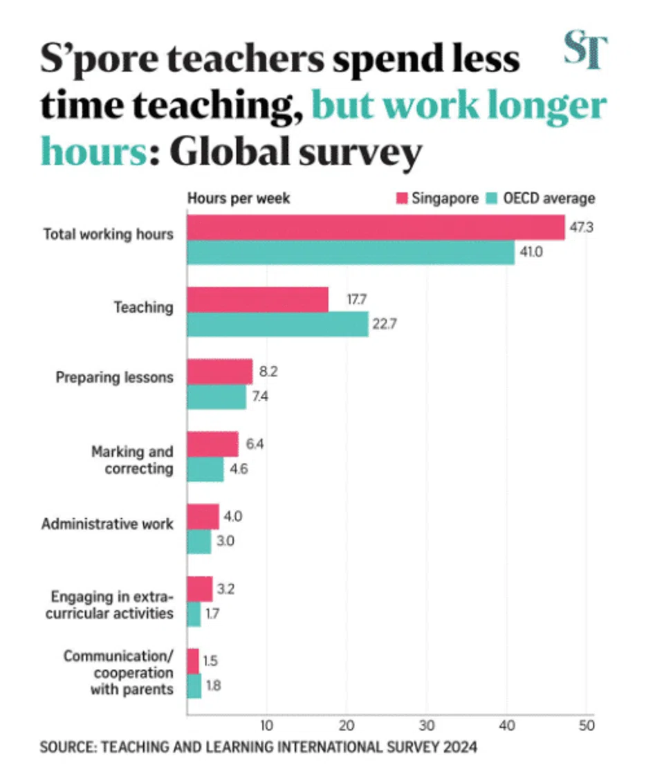 In October, it was reported that Singapore teachers rank as the third hardest-working in the world, averaging 47.3 hours per week.