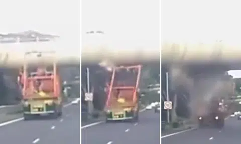 Driver arrested after top of his overheight trailer slams into bottom of Bedok North Flyover on PIE