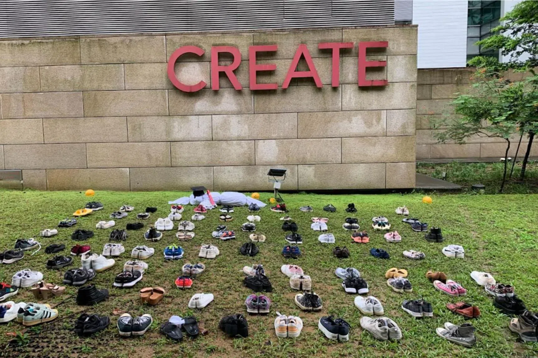 Some 124 pairs of shoes and a shroud were placed in front of the Create research building on campus, to "mourn and honour" Palestinian students who died in the Israel-Hamas war, according to the group.