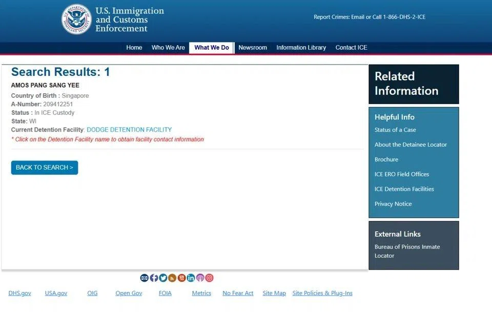 Singaporean child sex offender Amos Yee is now in the custody of the US Immigration and Customs Enforcement (ICE), with the 27-year-old likely to face deportation.