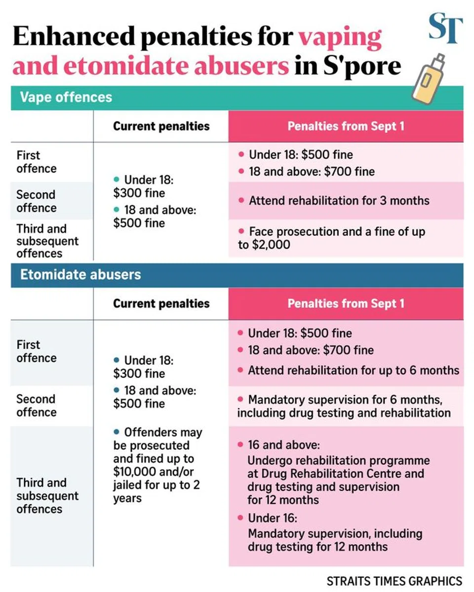 Prime Minister Lawrence Wong also said at the National Day Rally in August that imposing fines on vapers is no longer sufficient - it will now be treated as a drug issue, with "much stiffer penalties" imposed.