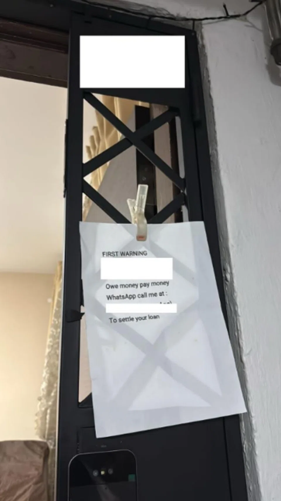 A photo shows the debtor's note pegged to the unit's front gate. The note requested its recipient to "WhatsApp call me" to "settle your loan".