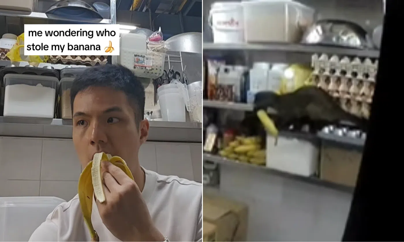 A 17-second TikTok video, with the title "Me wondering who stole my banana", includes CCTV footage of the culprit sneaking into the kitchen of At Tas Muffins, located at 49A Serangoon Garden Way, to grab a banana from a shelf.