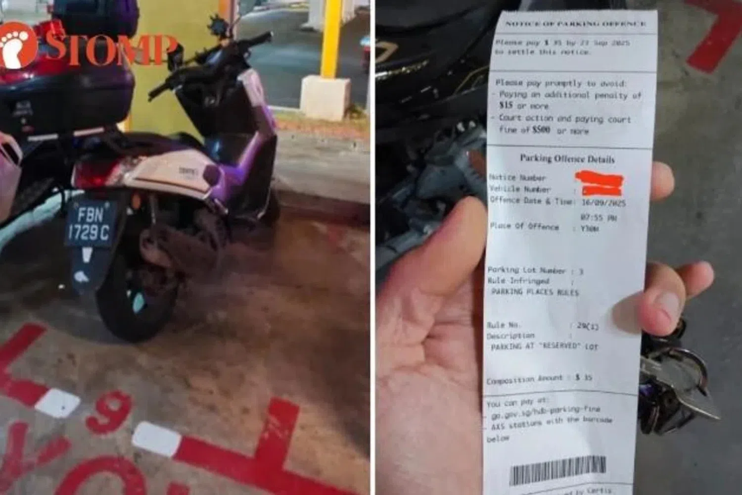 Stomper XJ was fined $35 for parking his motorcycle in a reserved lot in Yishun on Sept 16 at 7.55pm.