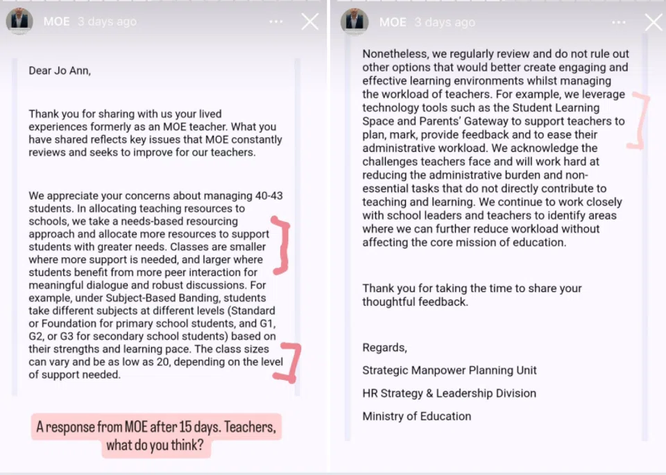 Ms Kuek received MOE's reply 15 days after her original email, which she shared on her Instagram stories on Nov 20.