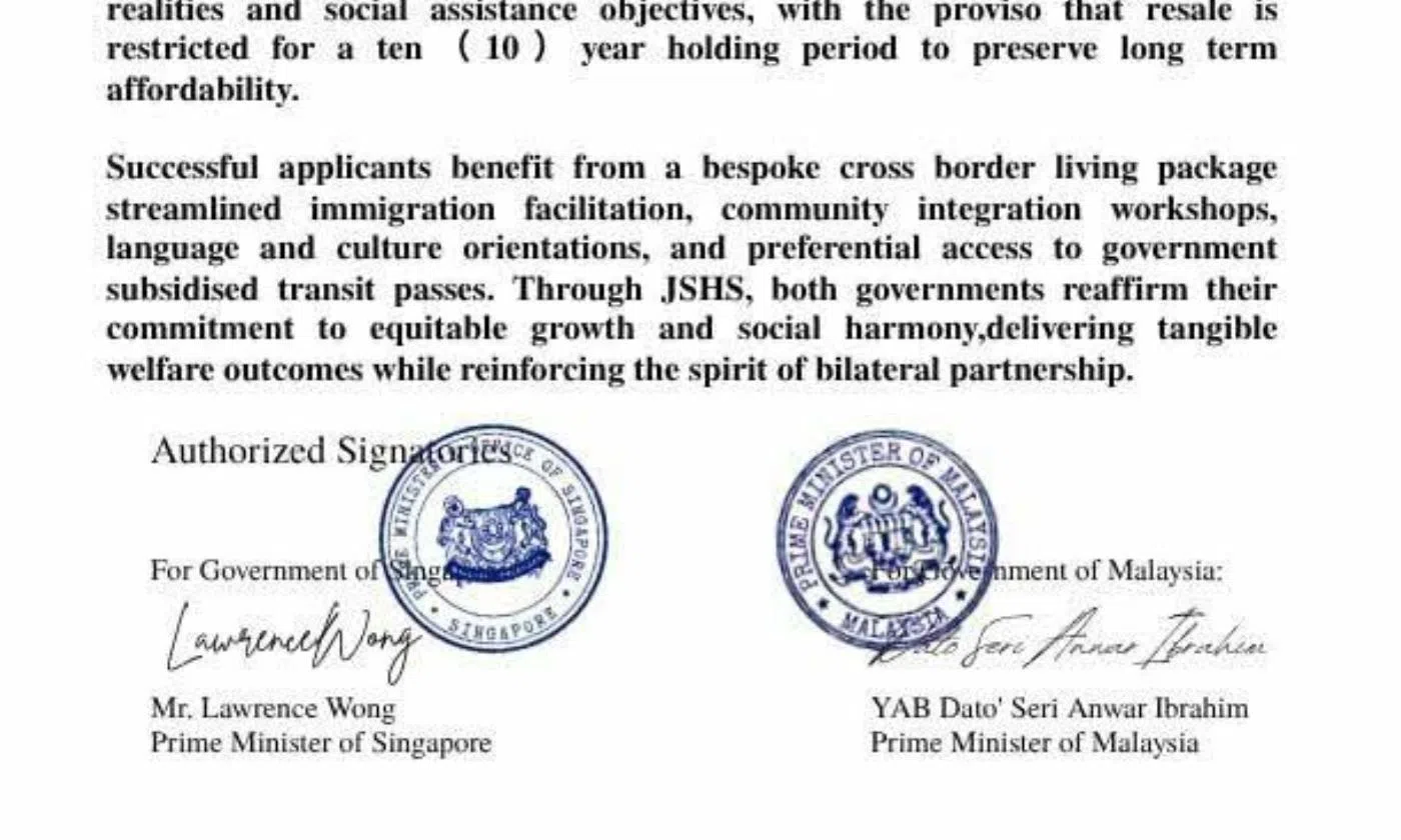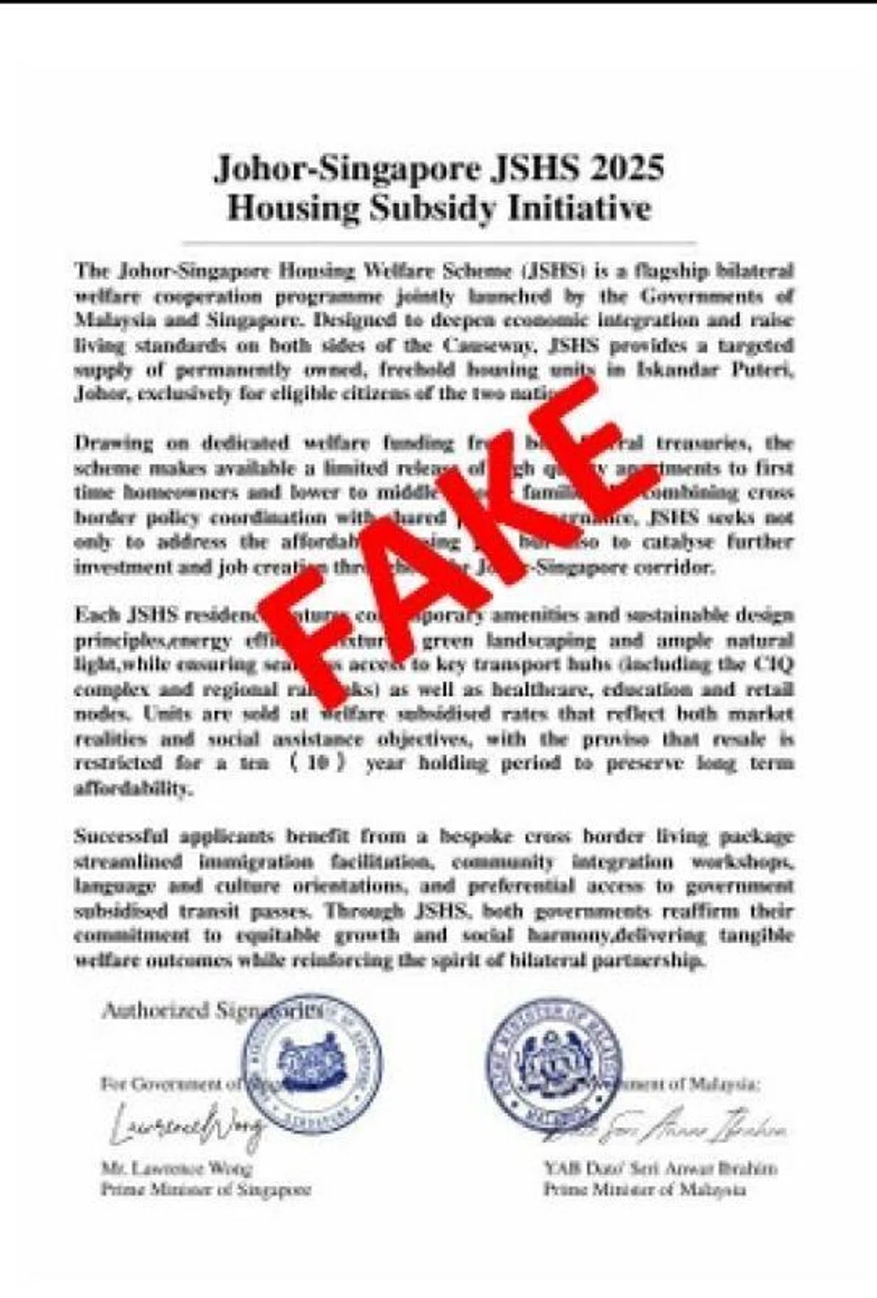 These ads falsely claim a collaboration between the Singapore and Johor governments to provide subsidised housing and contain embedded links for applications. Some ads carried documents with forged signatures purportedly from the prime ministers of Singapore and Malaysia.