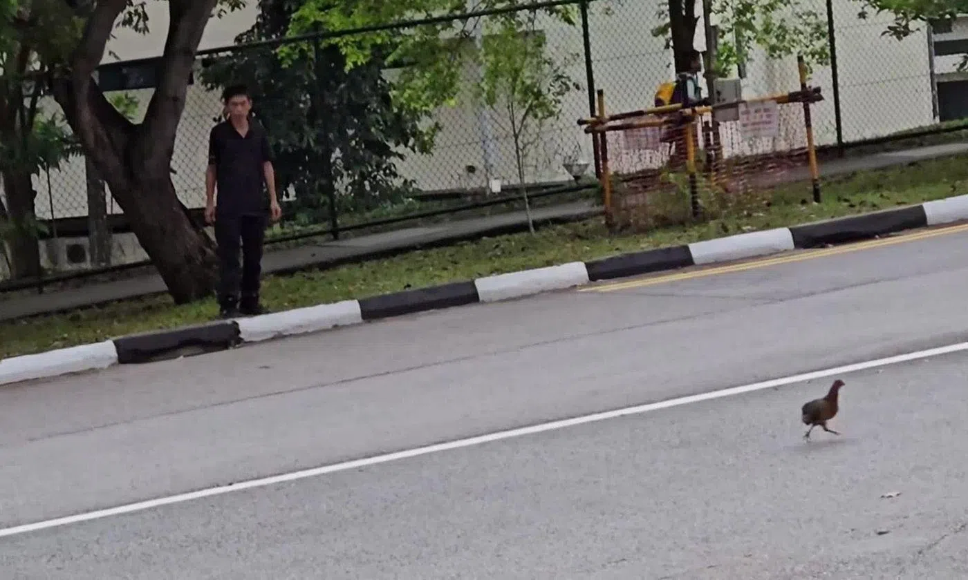 Facebook user Valerie Tan posted a video of the incident on March 24, showing a chicken dashing across the road while a man wearing black stands on the opposite side.