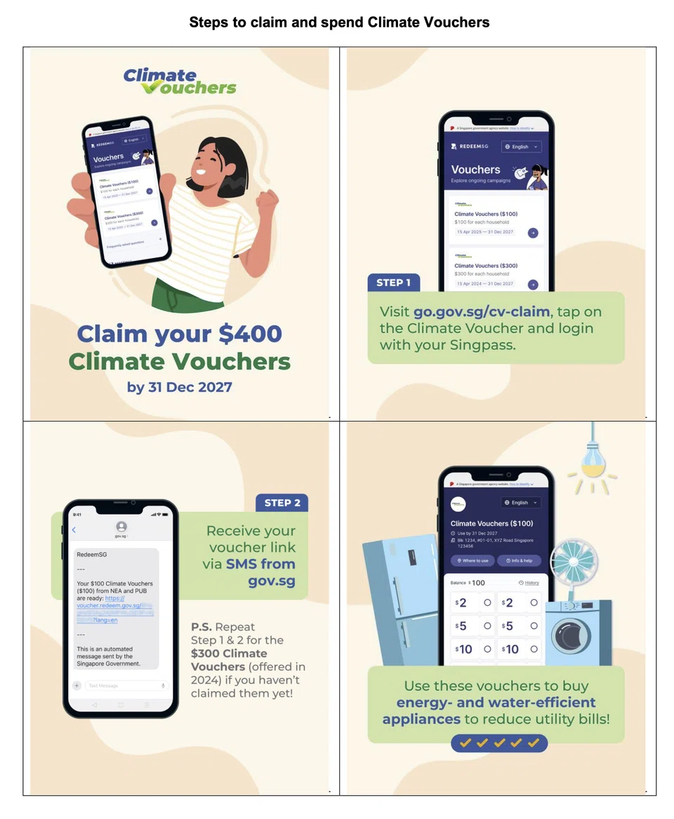 Singaporean and Permanent Resident HDB households have up to Dec 31, 2027, to claim an additional $100 in Climate Vouchers.