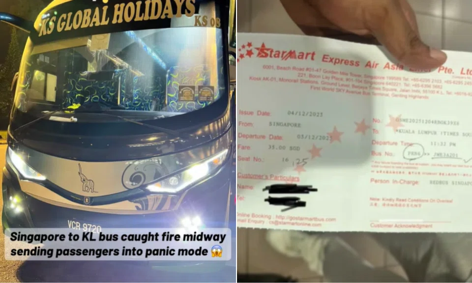 'F***ing stop the bus!': Passengers panic as sparks fall from ceiling on Singapore-KL coach