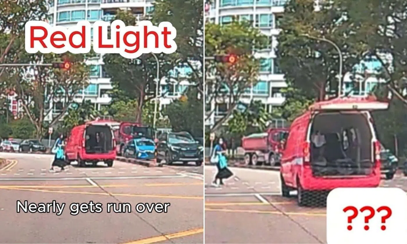 Without warning, the red GetGo van dashes through the junction, narrowly missing her. The woman manages to step back in time and avoids getting hit.