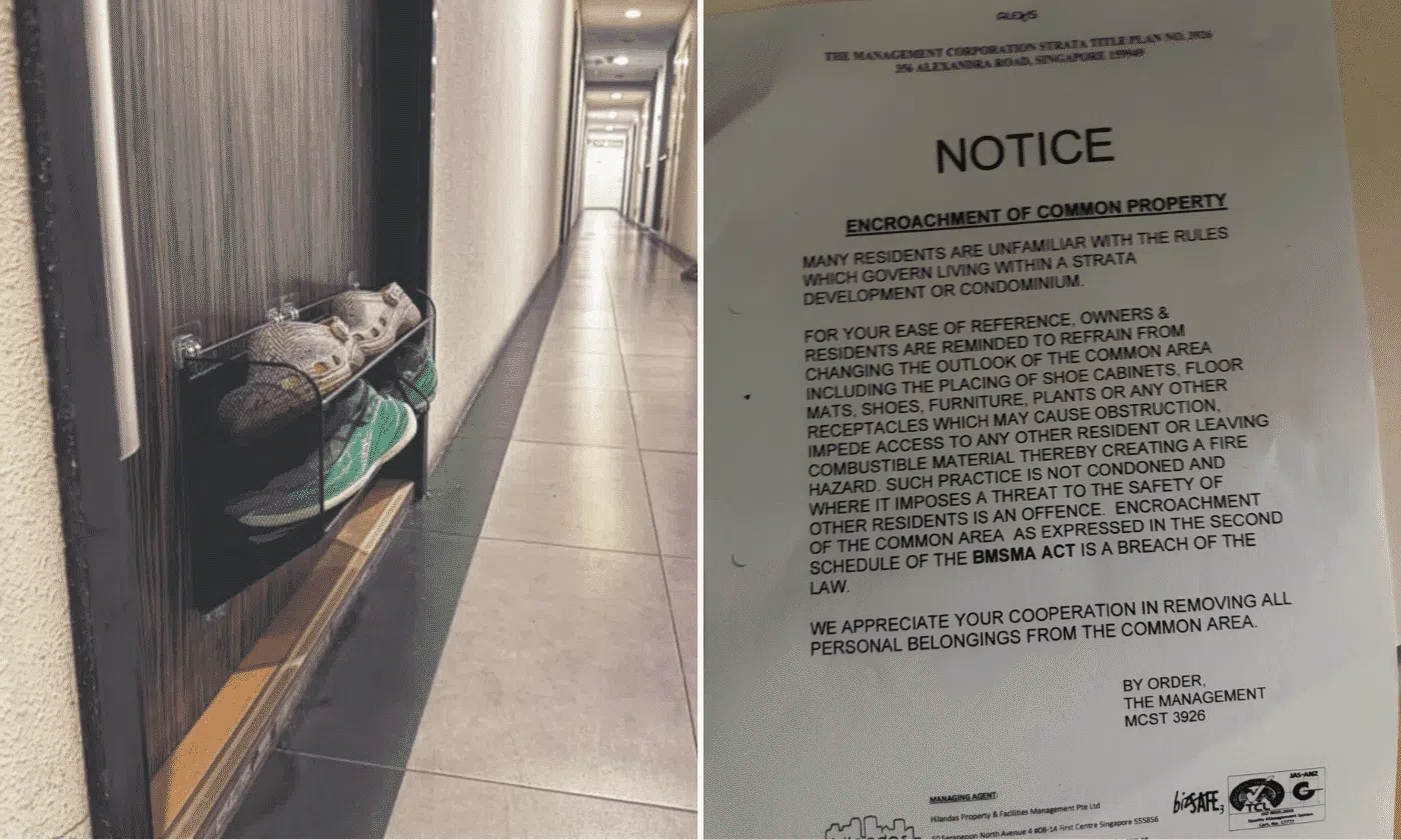 Ms Koh alleged that the management repeatedly issued notices instructing residents not to place shoe cabinets, floor mats, shoes, furniture, or plants in common areas.