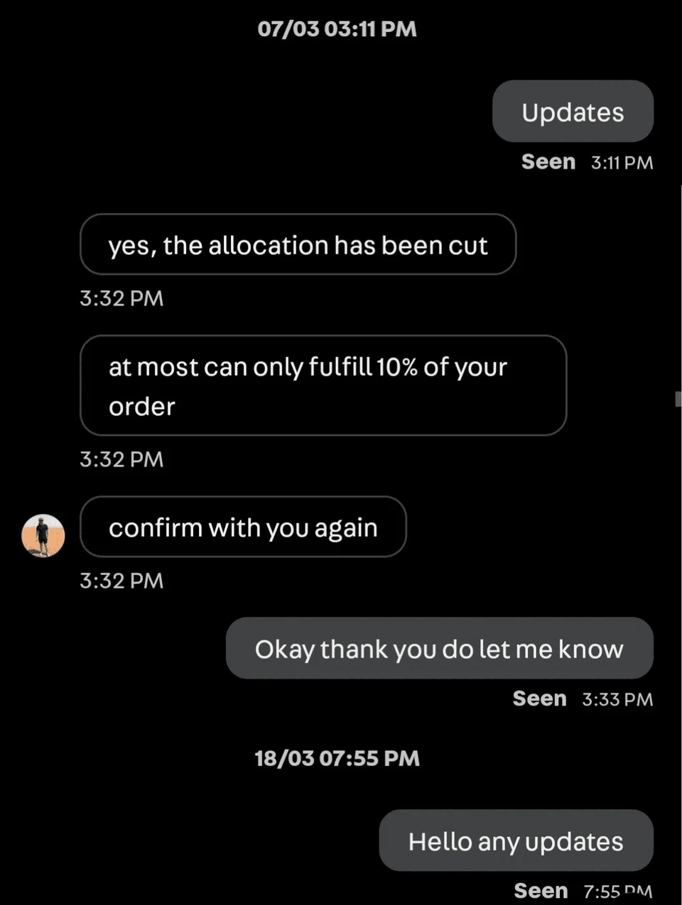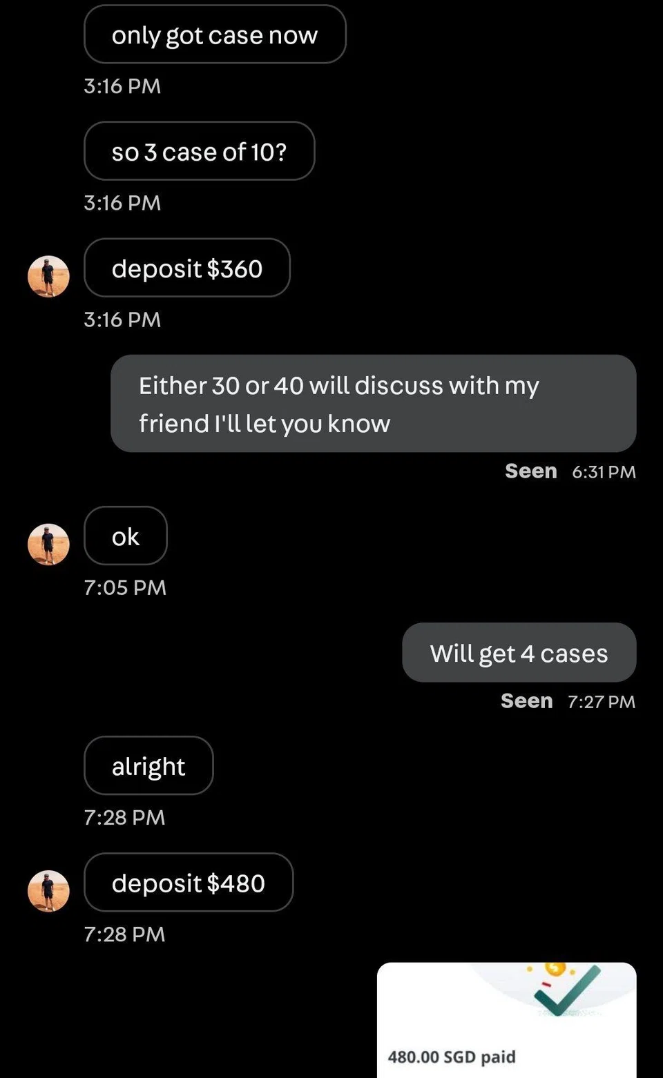 Before placing the preorder, he said that his communications with Kwek were "very prompt", sometimes receiving replies within the minute.