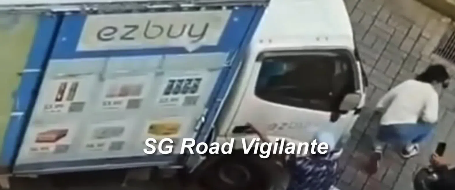 In a video posted on the SG Road Vigilante Facebook group, three people can be seen attempting to prevent a lorry from leaving what appears to be a parking lot or loading and unloading bay.