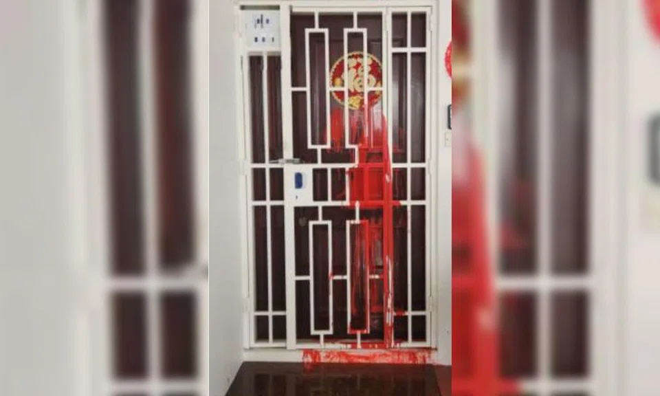 A 24-year-old man was arrested for suspected loanshark harassment after a residential unit at Bukit Batok Street 33 had its main gate splashed with red paint.