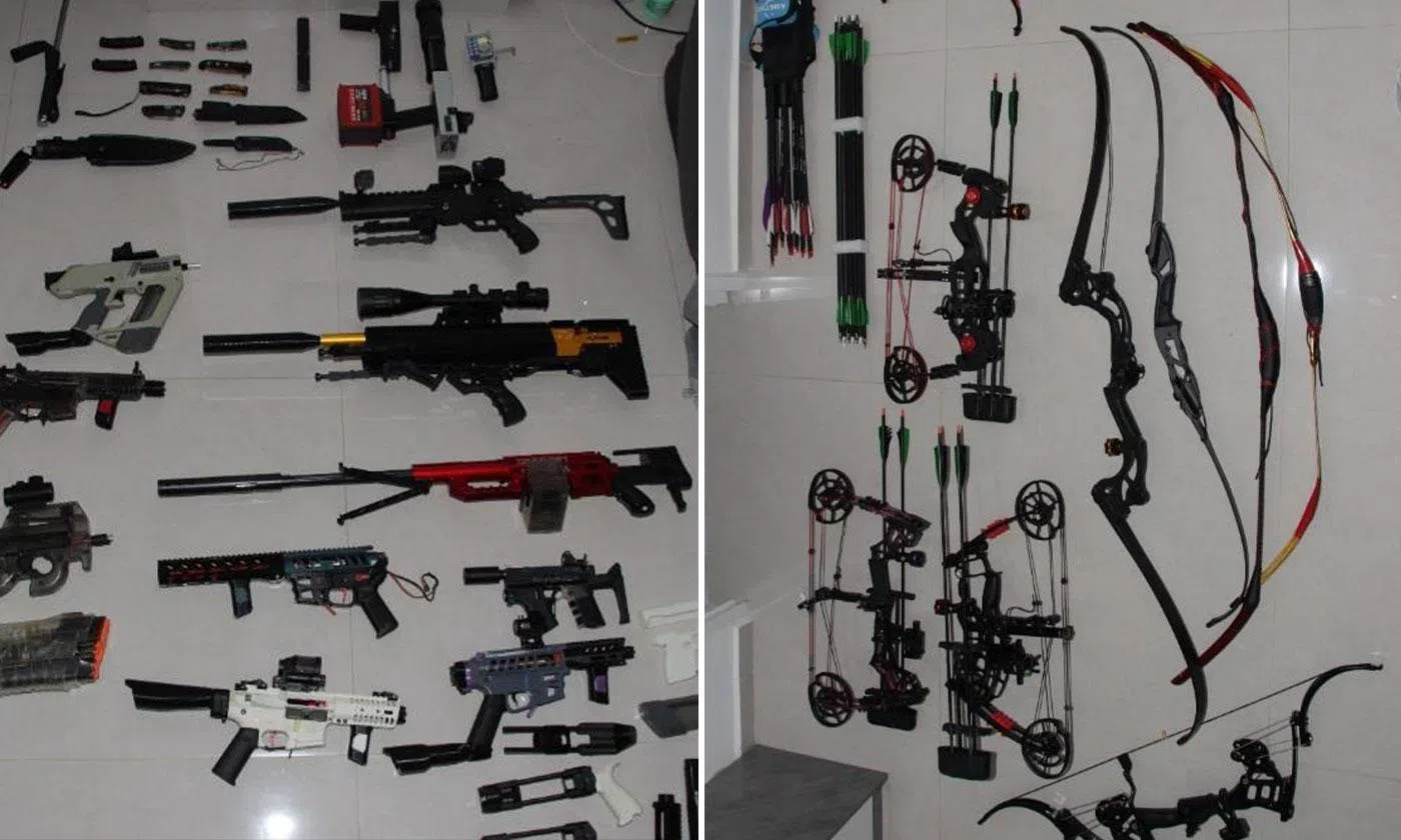 During the investigation, officers seized items including two pre-charged pneumatic rifles, four BB guns, four gel blasters, eight bows with 36 arrows, three 3D-printed crossbows with 83 arrows, three slingshots, nine flip knives, three knives with sheaths, one stun device, one extendable baton, and various projectiles.