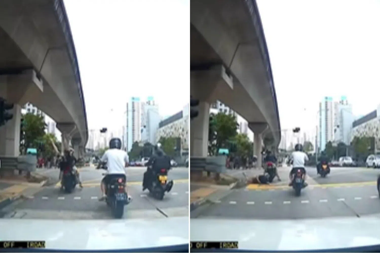 A motorcycle pillion rider lost his balance and fell off the vehicle as it moved off from a traffic light junction near Bukit Panjang Plaza.