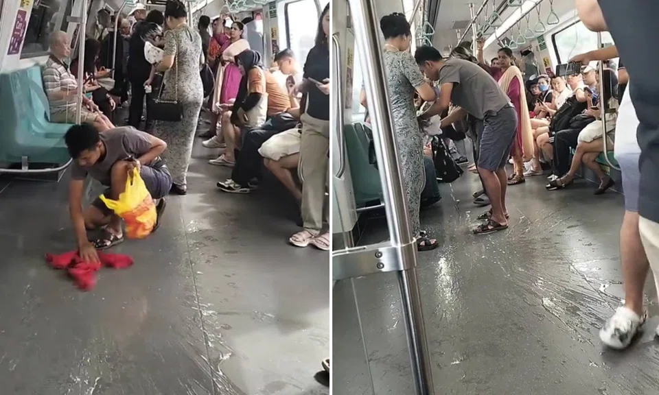 An MRT commuter's efforts to clean up a spill in a crowded cabin has warmed the hearts of netizens, who lavished praise on him.
