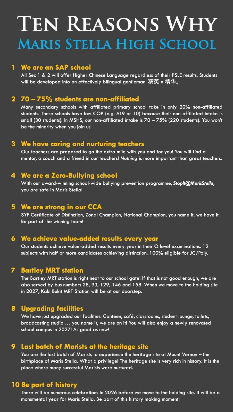 In a Facebook post on Nov 27, Maris Stella High School listed "Ten Reasons Why" potential students should choose to attend the almost 70-year-old school, which is already regarded as a prestigious institution.