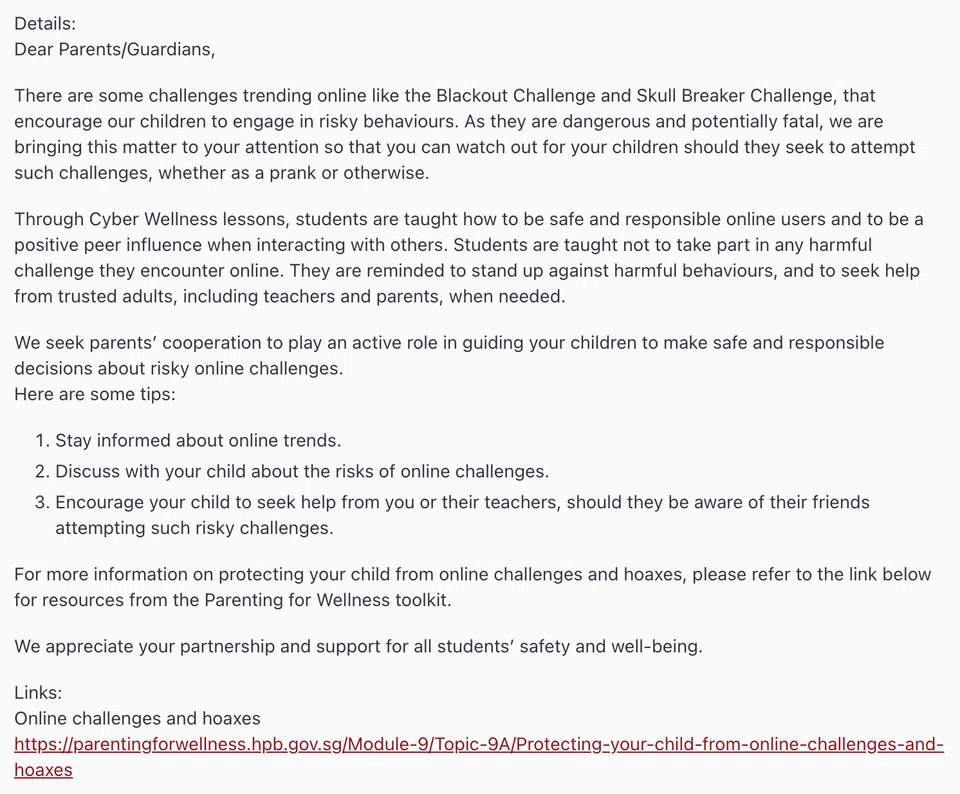 The MOE advisory alerted parents to dangerous trends such as the Blackout Challenge and Skull Breaker Challenge, which encourage children to engage in risky behaviours.