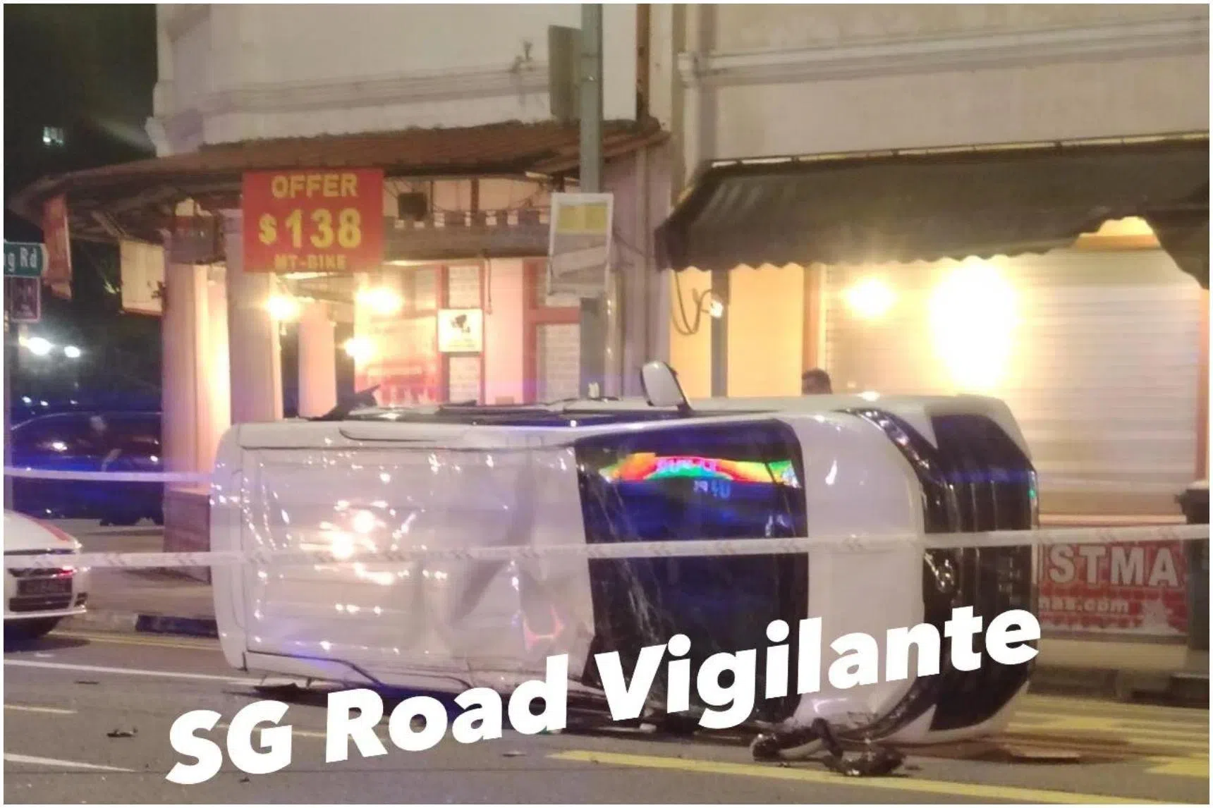 Photos uploaded on social media show a white vehicle flipped on its side near the kerb.