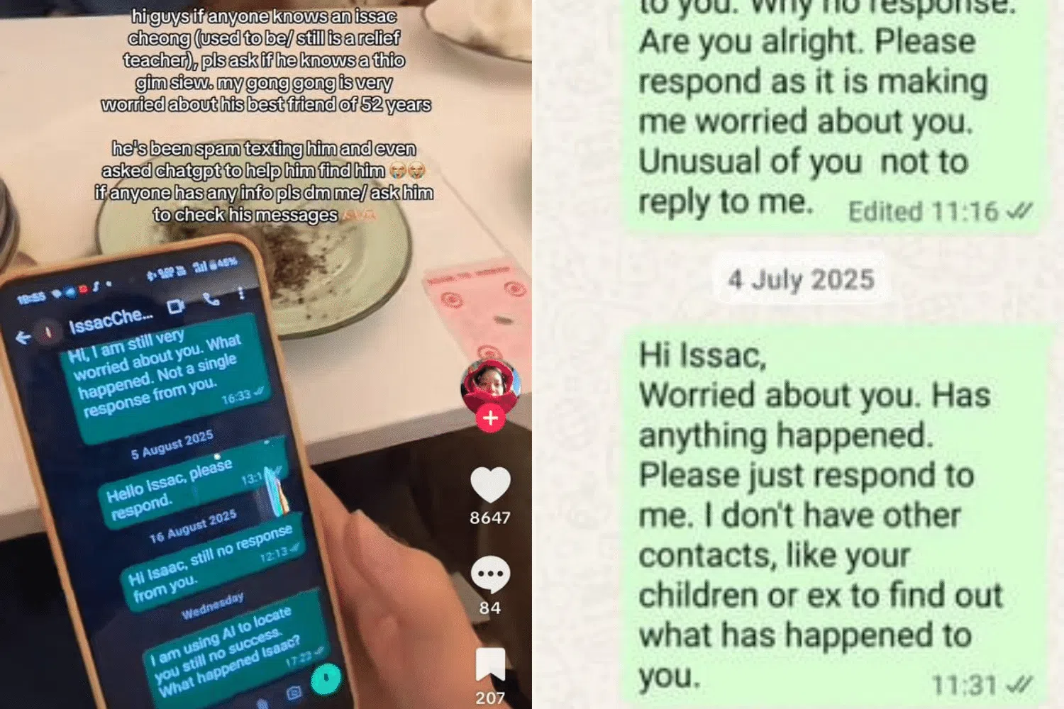 Out of worry about his friend’s whereabouts, Mr Thio asked his grandniece Kristen to use social media to locate Mr Cheong. "He’s going to retire in about a month’s time. He’s hoping to catch up with friends and enjoy his retirement," said the 20-year-old undergraduate.