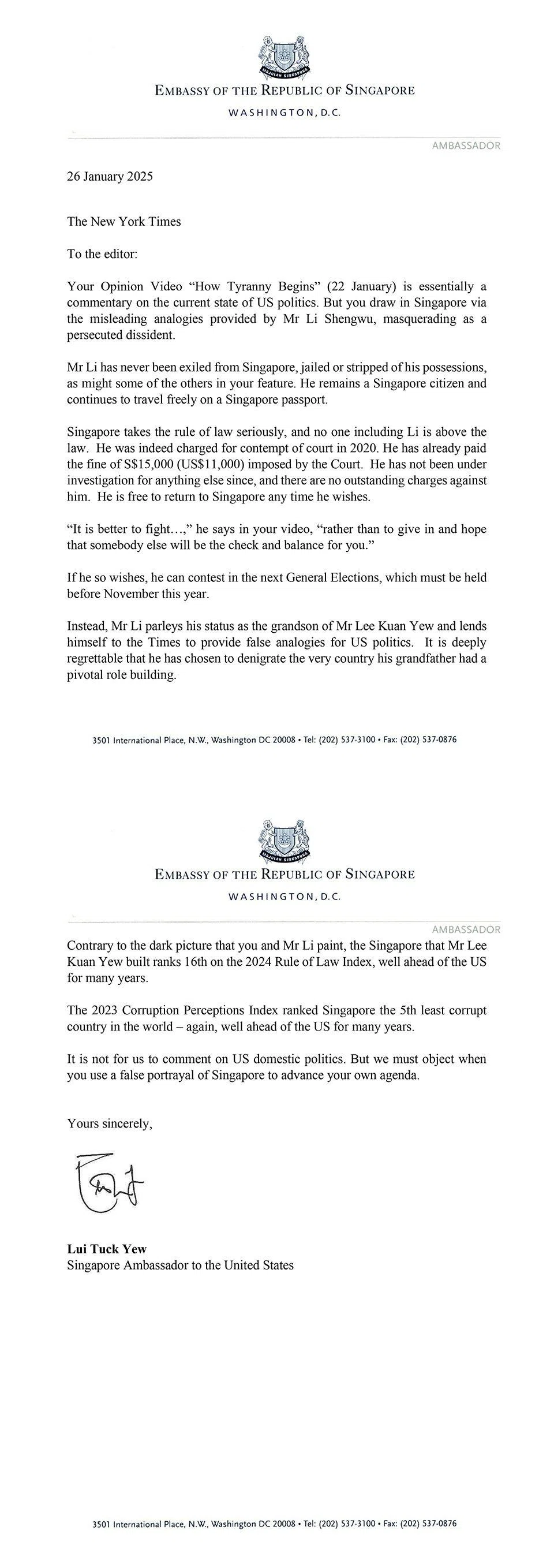Singapore’s Ministry of Digital Development and Information (MDDI) on Jan 27 released to local media this letter and another responding to a separate NYT article.