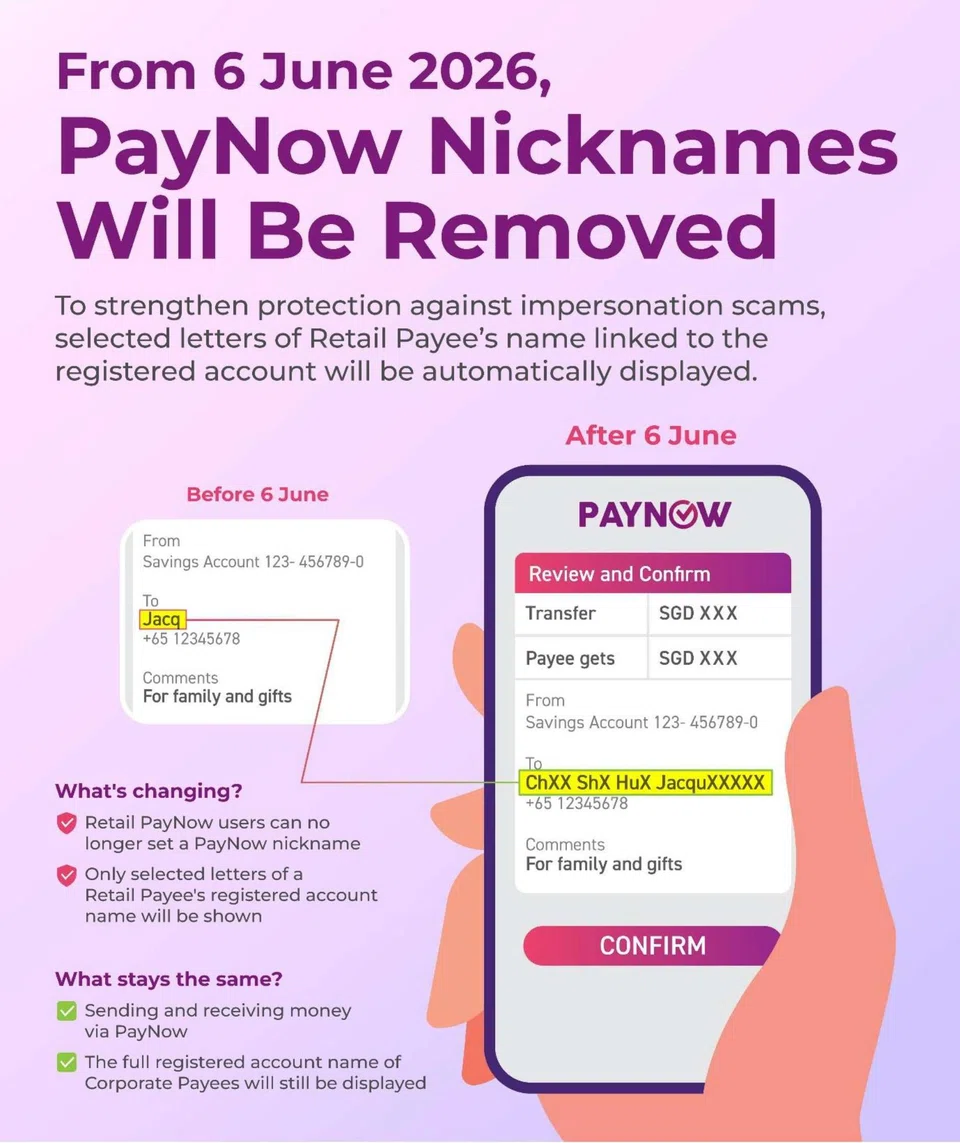 PayNow users will no longer be able to customise their display names from June 6. Instead, transactions will reflect the name registered with their bank, with only selected letters shown to protect their privacy.