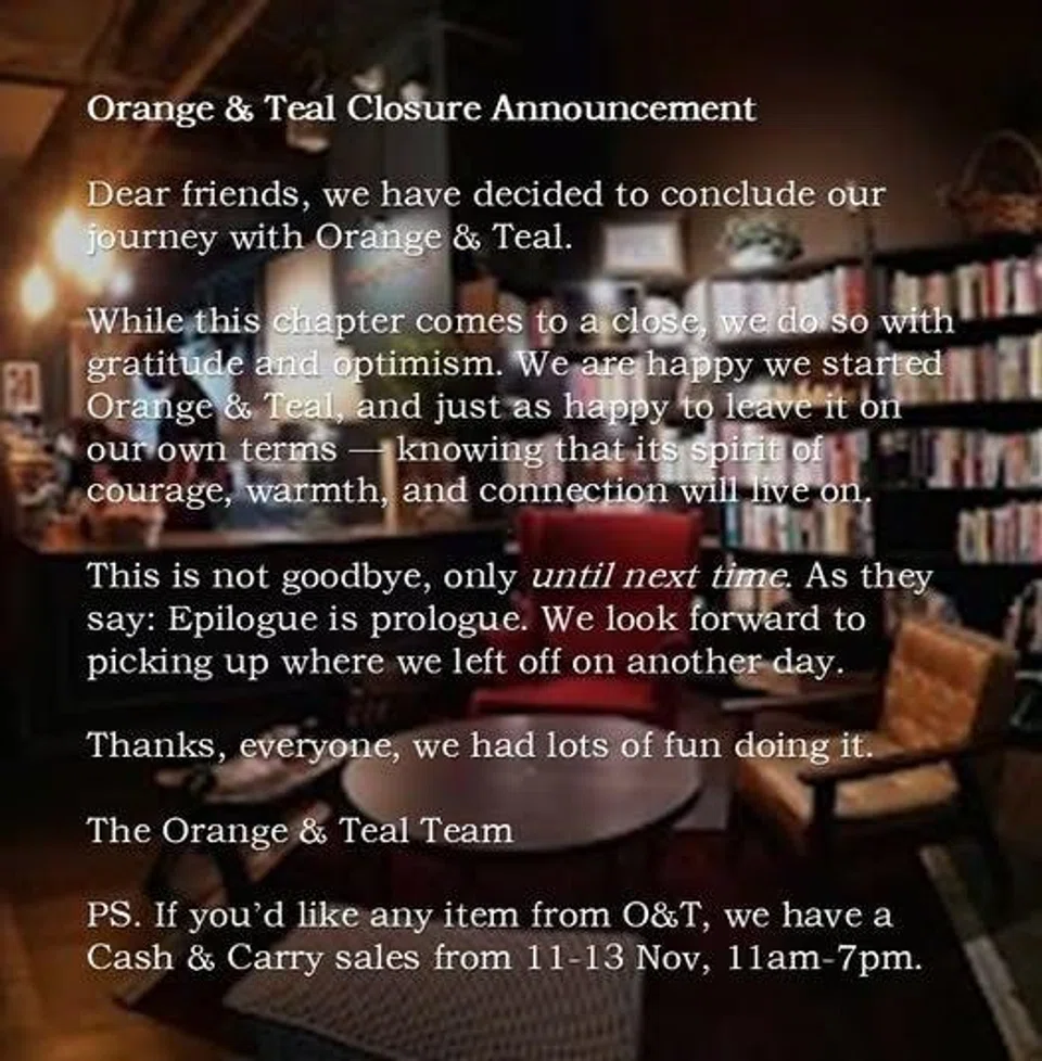 Orange & Teal will also be holding a "cash & carry" sale, allowing customers can purchase items from their store from Nov 11 to 13, between 11am and 7pm.
