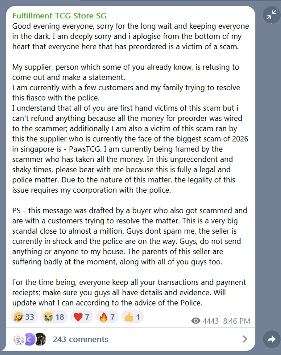 Mr Ang also claimed to have received a call from PawsTCG, whom he said admitted to the scams and a "gambling problem". However, since buyers dealt directly with Fulfillment TCG Store SG, most police reports were filed against him instead.