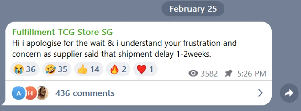 A delivery window of Feb 23 to 25 was promised. However, on Feb 25, Fulfillment TCG Store SG sent a broadcast message announcing a shipment delay of one to two weeks. It was then that buyers began to grow suspicious.