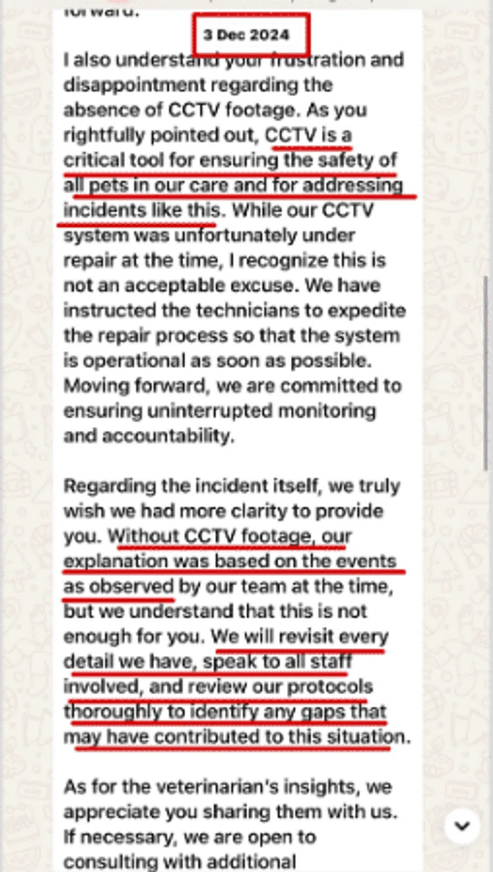 Owner questions Pawsome's explanation without CCTV footage