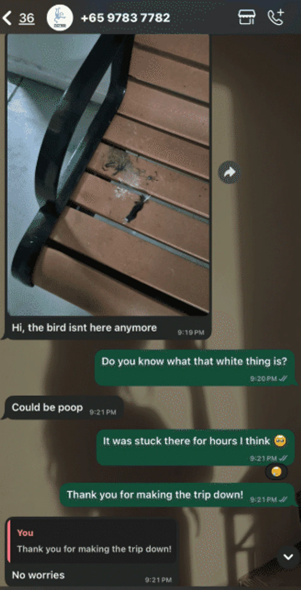 In the comment section of her TikTok post, she shared screenshots of a conversation with Acres, which showed that the mynah was no longer on the bench when Acres arrived at the scene on the night of Nov 2.