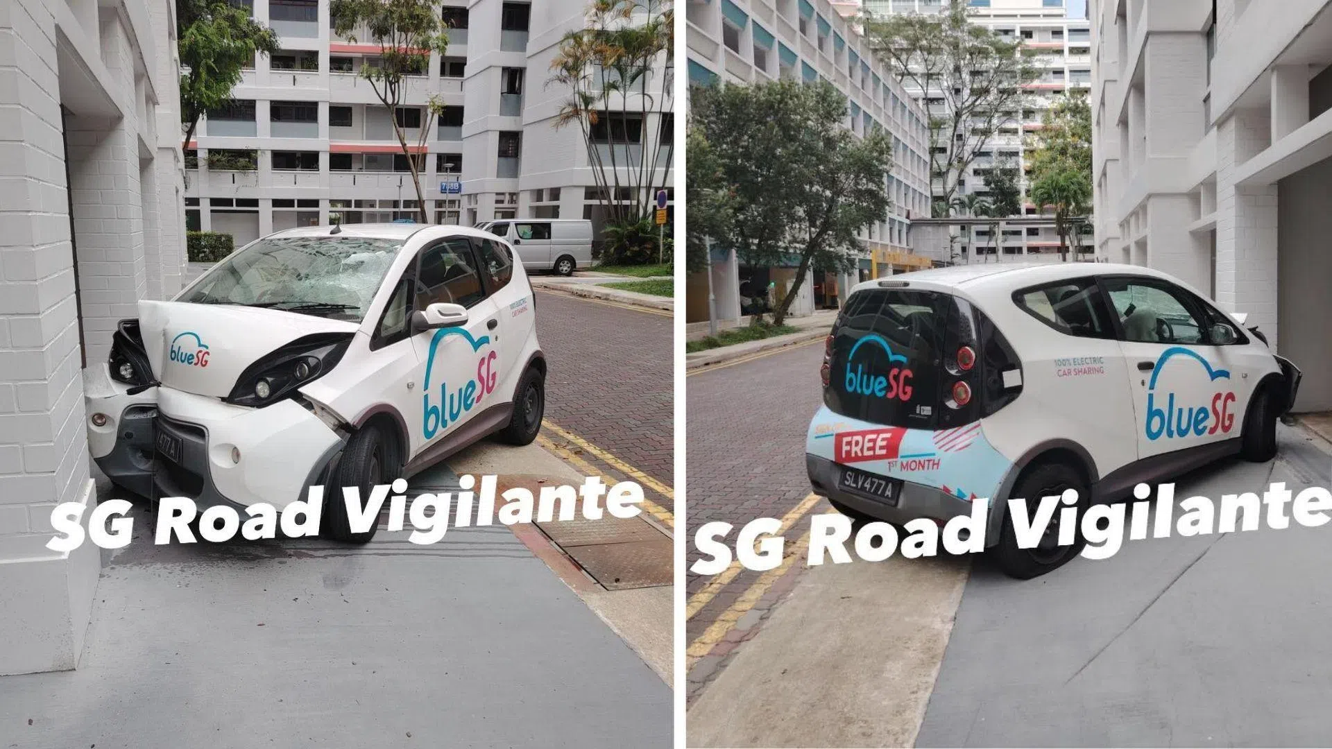 In pictures of the accident uploaded to the SGRV Front Man Facebook group, the BlueSG car can be seen stationary on a pavement under the HDB flat. The car's bonnet and bumper appear to be badly damaged.