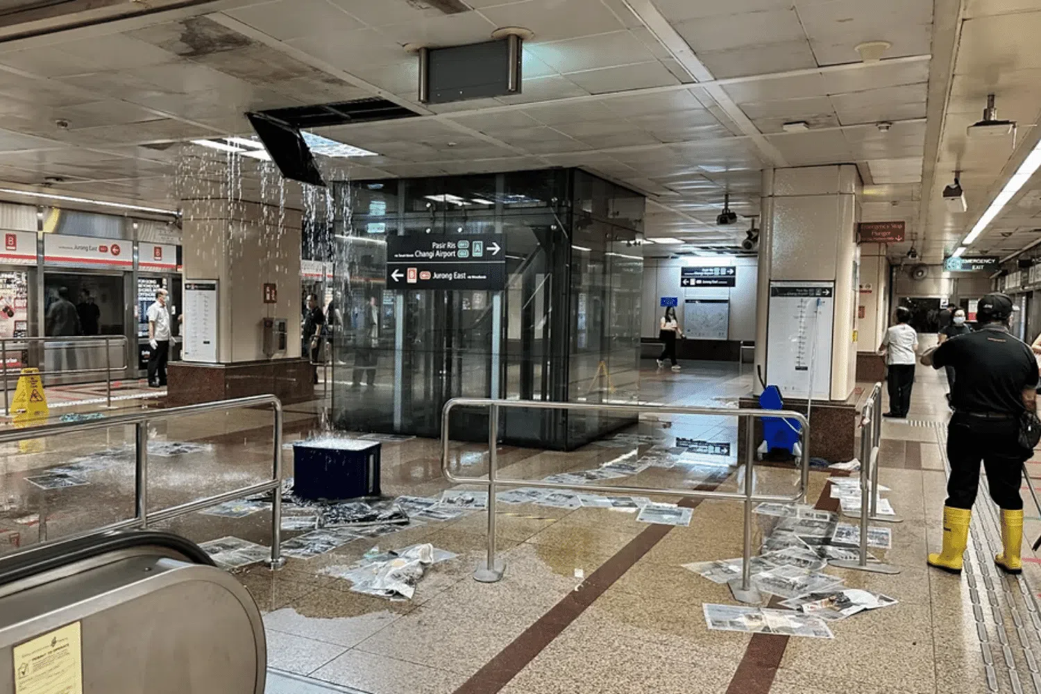 Commuters at Raffles Place were met with water gushing from a dislodged panel in the station's ceiling on the morning of Sept 17.