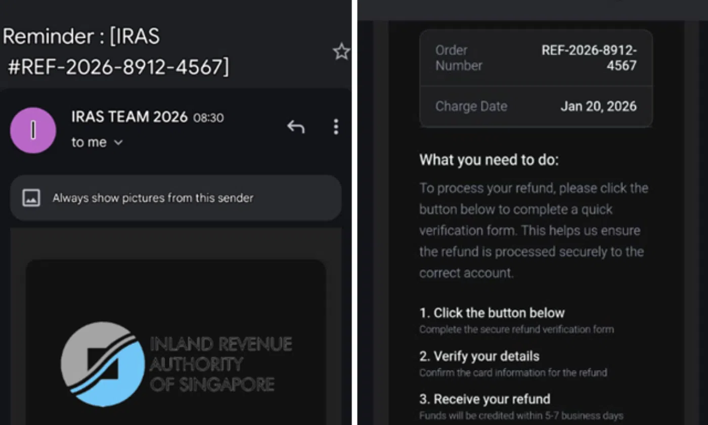 In this scam variant, victims would receive unsolicited emails from scammers purportedly from 'IRAS', informing them that they were eligible for tax refunds.