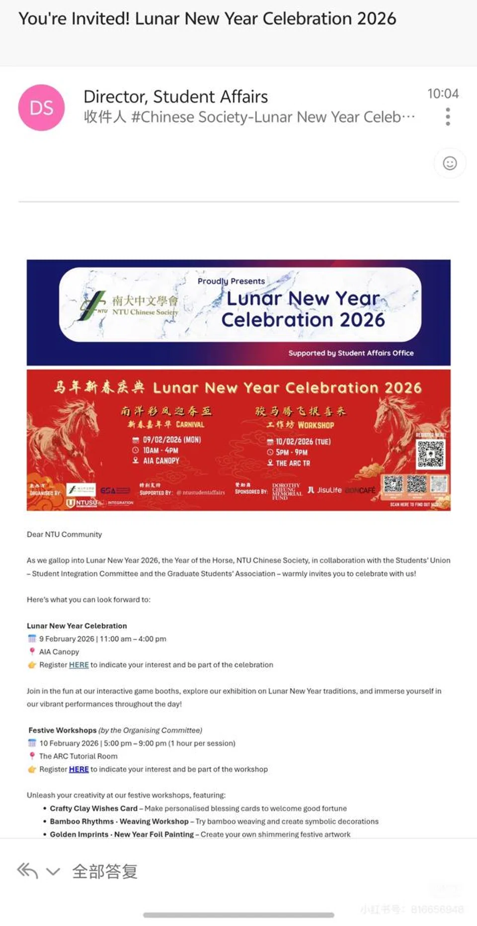 In a Feb 3 post on Chinese social media app Xiaohongshu, user @CRISPYC shared a screenshot of the email, which purportedly showed an invitation from NTU's Director of Student Affairs to a two-day "Lunar New Year Celebration" on Feb 9 and 10, organised by the NTU Chinese Society.