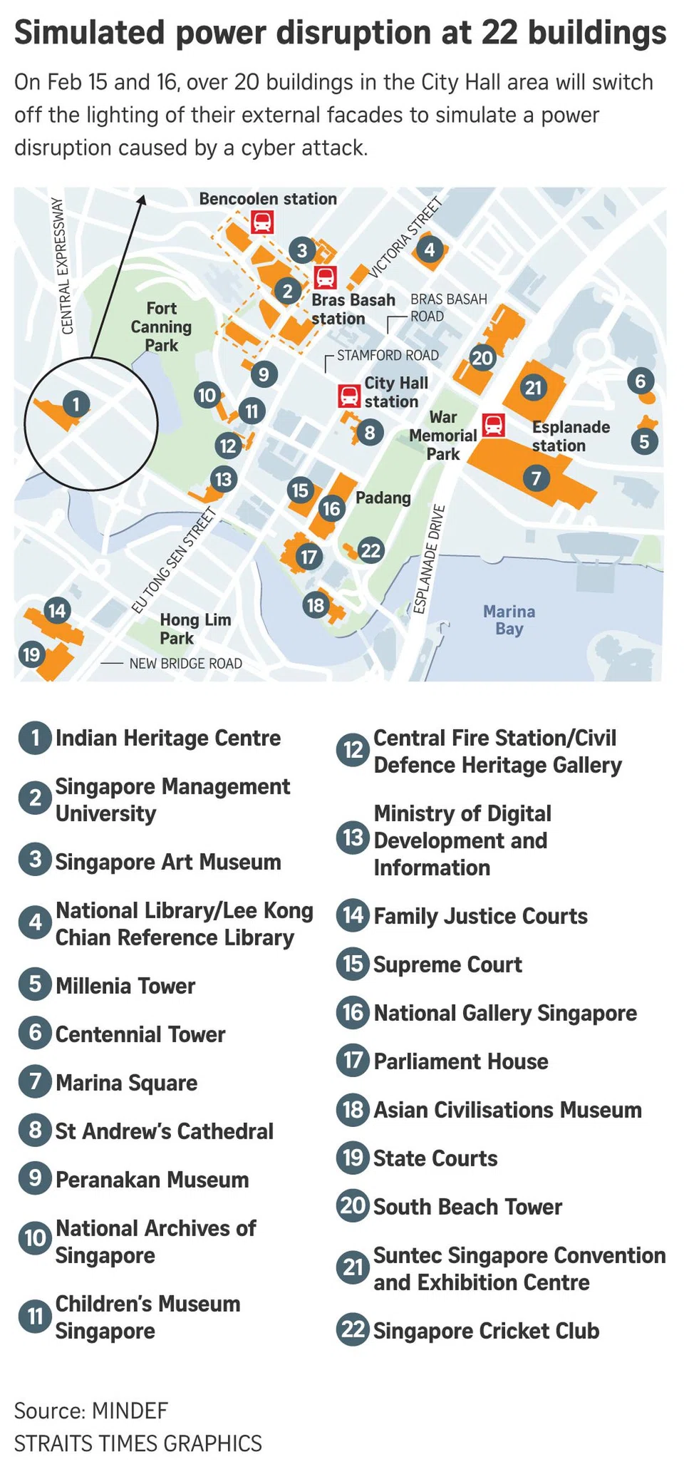Under the exercise, over 20 buildings in the city area will be switching off their facade lights to simulate a blackout from Feb 15 to 16.