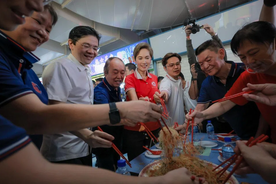 After the event, PM Wong walked around Chinatown Complex, where he greeted and took photographs with surprised diners and shoppers. He stopped by for a Chinese New Year lohei session at the food centre with representatives from the Chinatown Complex Hawkers' Association.