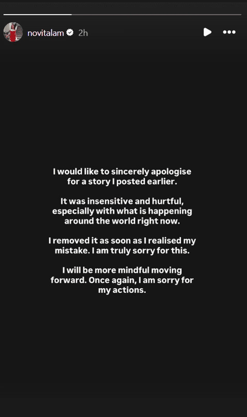 Local influencer Novita Lam has apologised after facing backlash over an "out of touch" Iran-Israel pun she posted on her Instagram Story amid the conflict in the Middle East.