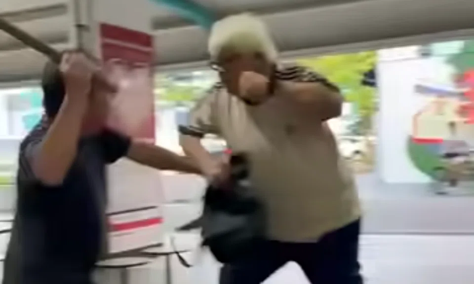 The video, shared on public Facebook group Complaint Singapore by @Raven Qiu on Nov 25, shows a stout man with a full head of white hair charging at another man who is armed with a stick.